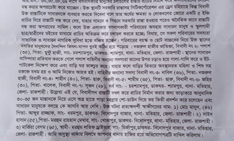 ভুক্তভোগীরা জানান, একই রাস্তায় আবারো দেয়াল নির্মাণ করে চলাচলে প্রতিবন্ধকতা সৃষ্টি করেন জামায়াত নেতা নজরুল ইসলাম। ঐ রাস্তার সামনে ও পিছনে সরকারি রাস্তা। ফলে অবৈধভাবে রাস্তাটি বন্ধ করা অপরাধের সামিল। ফলে উক্ত এলাকায় বসবাসকারী পরিবারের অসহায় সাধারণ মানুষ ও স্কুলগামী শিক্ষার্থীদের মইয়ের মাধ্যমে প্রাচির অতিক্রম করে চলাচল করতে হচ্ছিল। এ ঘটনার প্রতিবাদ করায় গতকাল শুক্রবার বিবাদী নজরুল হাজীর ভাতিজা, তার ভাতিজা পলাশ, পিতা- মুন্টু হাজী ভুক্তভোগীদের ওপর হামলা চালায়। তারা ইট- পাটকেল নিক্ষেপ এবং বাড়ি ঘর ভাঙ্গচুর করে। ফলে বাড়ির ভিতরে অবস্থানরত মহিলা ও শিশু সহ রক্তাক্ত যখম হয় ও বাদী নিজেও আহত হন। বাহিনীর অন্য সদস্য নাবিল, পিতা- নজরুল হাজী, শাহীন, পিতা- ছারু, শামীম, পিতা- ছারু, জহির, পিতা- খালেক, সুজন সকলের ঠিকানা চরশ্যামপুর, থানা মতিহার, জেলা- রাজশাহী।