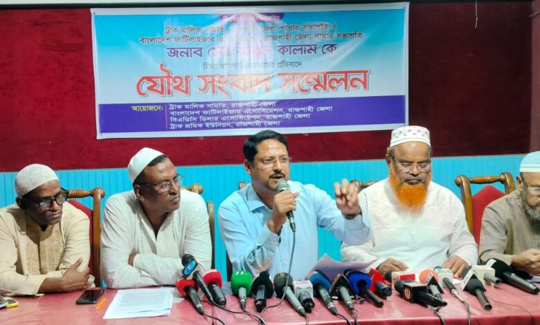 শাহিনুর রহমান সোনা, রাজশাহী: ট্রাক মালিক সমিতি রাজশাহী জেলা শাখা ও ফার্টলাইজার এসোসিয়েশন রাজশাহী জেলা ইউনিটের সভাপতি মো: আবুল কালাম’কে মিথ্যা মামলায় গ্রেপ্তারের প্রতিবাদে যৌথ সংবাদ সম্মেলন অনুষ্ঠিত হয়েছে।