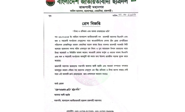 বিজ্ঞপ্তিতে বলা হয়, আওয়ামীলীগের দোসর গ্রীন প্লাজা রিয়েল এস্টেটের ব্যবস্থাপনা পরিচালক মোস্তাফিজুর রহমান মিথ্যা চাঁদাবাজির মামলা দায়ের করেন। এই মামলায় রাজশাহী সরকারি সিটি কলেজে ছাত্রদলের সদস্য সচিব এমদাদুল হক লিমন ও যুগ্ম আহবায়ক বিশাল রহমানের নামও আছে। মোস্তাফিজুর মিথ্যা বানোয়াট ও ভিত্তিহীন মামলা করেন। আওয়ামী দোসর কর্তৃক এ ধরনের মামলা বিএনপি এবং অঙ্গ ও সহযোগী সংগঠনের ভাবমূর্তি নষ্ট করার জন্য উদ্দেশ্য প্রণোদিত ষড়যন্তমূলক ভাবে করেছেন।