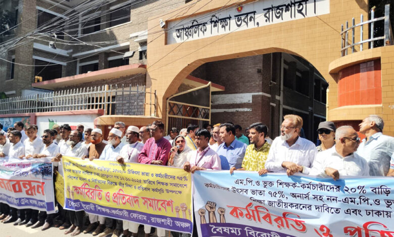 শিক্ষক সমাবেশে হামলার প্রতিবাদে রাজশাহীতে কর্মবিরতি, মানববন্ধন ও বিক্ষোভ সমাবেশ